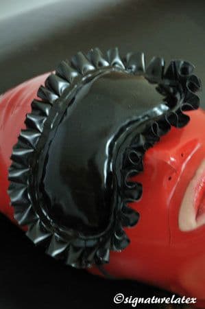 Latex padded blindfold with matching latex frill. Very comfortable to wear and can be worn over a hood. It is held in place by  latex strap with 3 bar slide Just pick your colour choice!